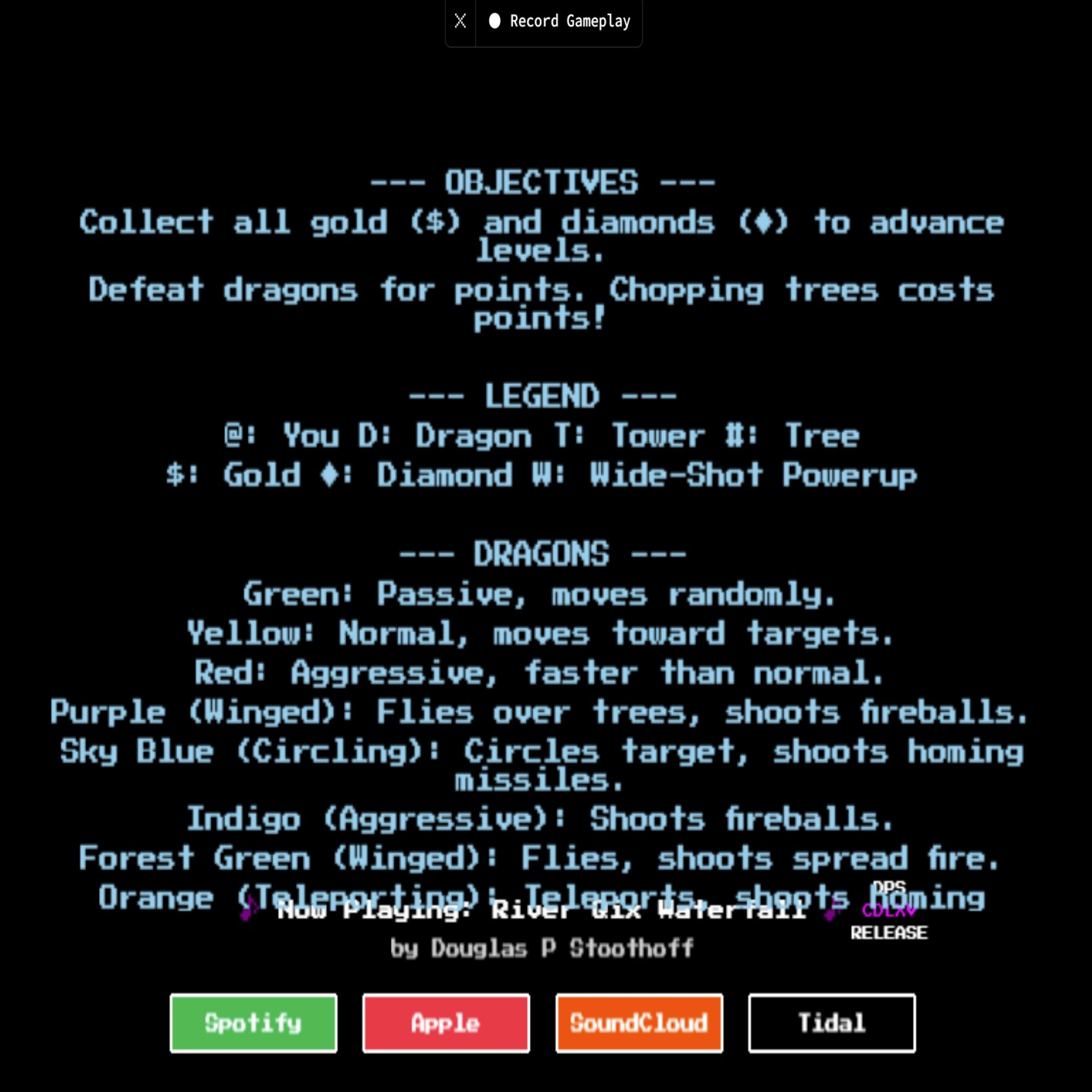 maze aspect: is you complete a level like a pac-man where you must pick up the gold ('$' like Moria or Angband) and diamonds (diamond symbol) both to advance and clear the level. Dragons spawn in and breath fire.