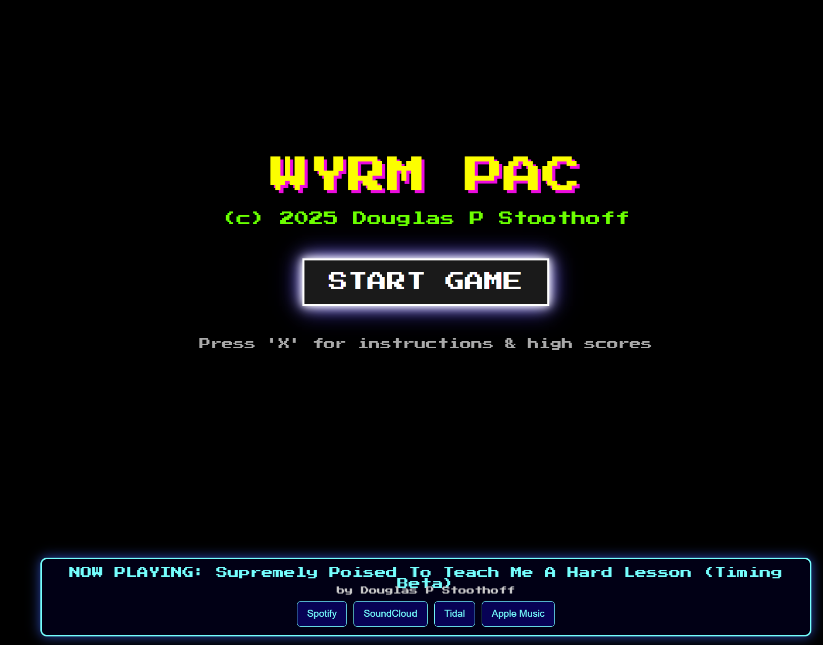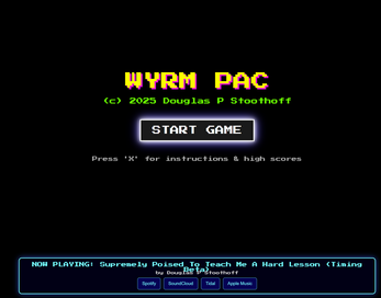 The current status of Wyrm-Pac is half-broken but a lot of my things are slightly illogical games where its just a vehicle so people can access the music tracks indirectly and check them out on the streaming platforms.